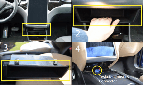 Majoriteten av Teslas modeller använder sig inte av standardanslutningen ”OBD” och därför måste special-kabel användas i Teslas modeller. Vänligen se kapitel ”Kablar” för att välja rätt kabel. Nedan visas generella anslutningsställen för Tesla, vänligen notera att avvikelser kan förekomma.
