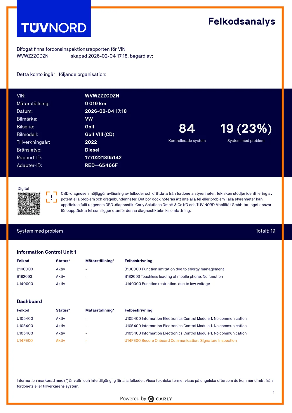 Överskådelig bild över batteriets hälsa (SoH) + Felkoder relaterade till högspänningsbatteri/relevanta moduler