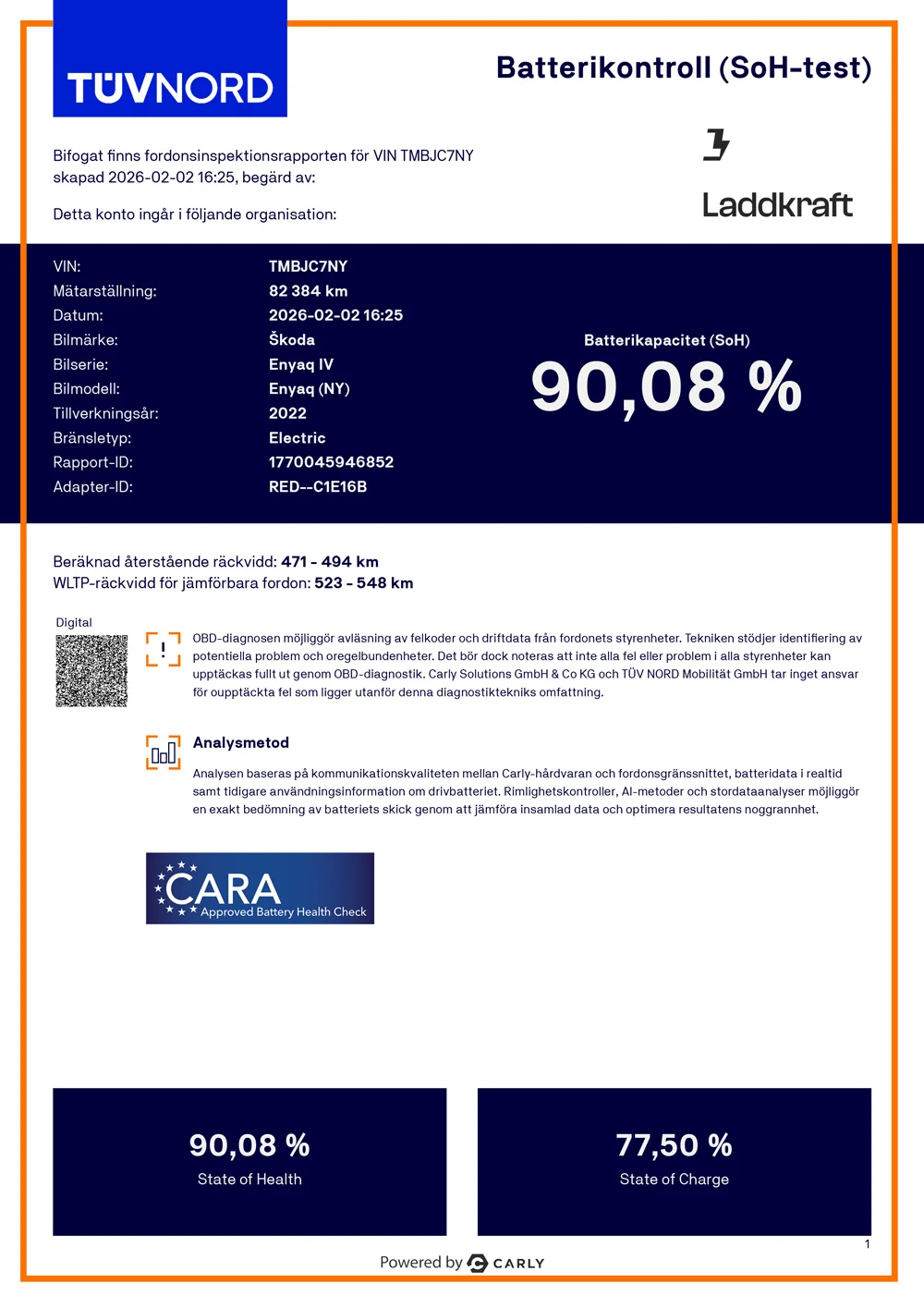 Här läses data av från bilen och därefter skickas datan för analys och rapportgenerering. Tillbaka får du en färdig rapport och en enkel överblick över batterihälsa och ev. felkoder relaterade till högspänningssystemet. Testet är CARA godkänt, helautomatiskt och tar mellan 3-5 minuter att utföra.